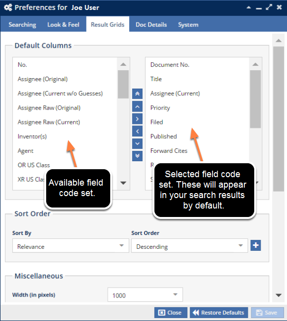 Notice the left column above displays the available field codes which will vary depending on the type of plan you purchased. If you want them to appear in your search results by default, drag and drop them into the box on the right. You can add more than one at a time by using the shift or control key and highlighting more than one before you add them. Within the selected field set, change the order in which the columns appear by dragging and dropping. You must click Save in order for the changes you have made to your defaults to take effect. Clicking Close without saving your new preferences will keep your previous preferences intact.