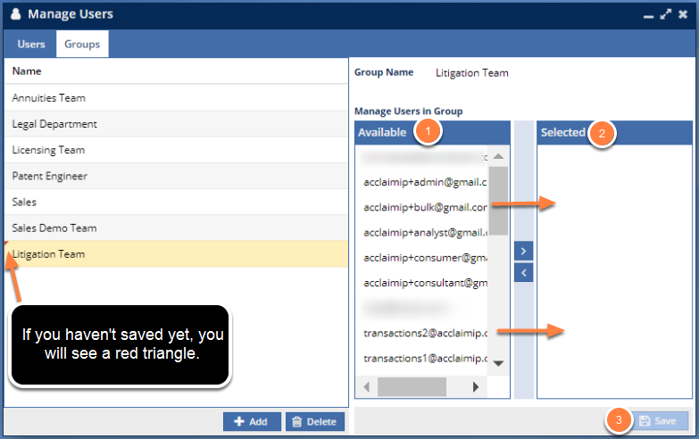 Drag the users you want to assign to the group from the Available set of names (1) to the Selected set of names (2) and click Save button (3).