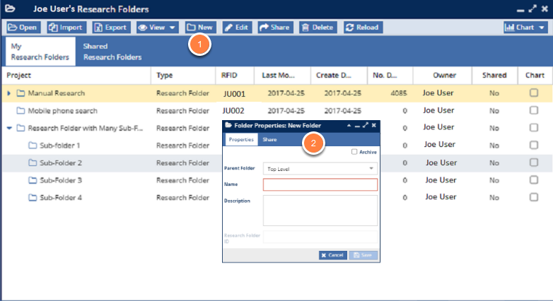 - View the imported patents in the specific research folder (1) by double clicking on the folder or selecting the folder checkbox and clicking Open (2) in the Research Folders toolbar.