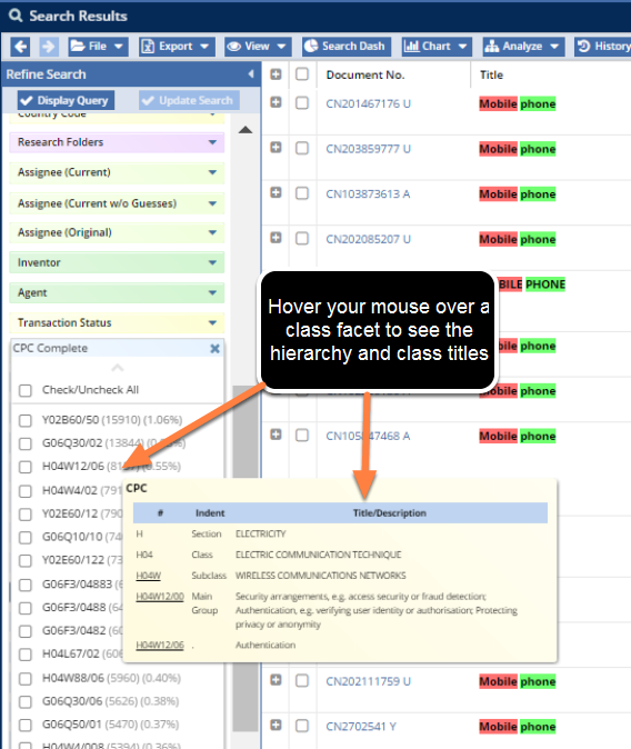 You could, of course, query these classes using the Search field. If you wanted to do this for the example above, your search query would be CPC:H04W12/06. However, this would require you to be familiar with the classes that you want to search for. Instead, AcclaimIP allows you an easier method to drill down into the classes and heirarchies through using the facets found in the Refine Search panel.